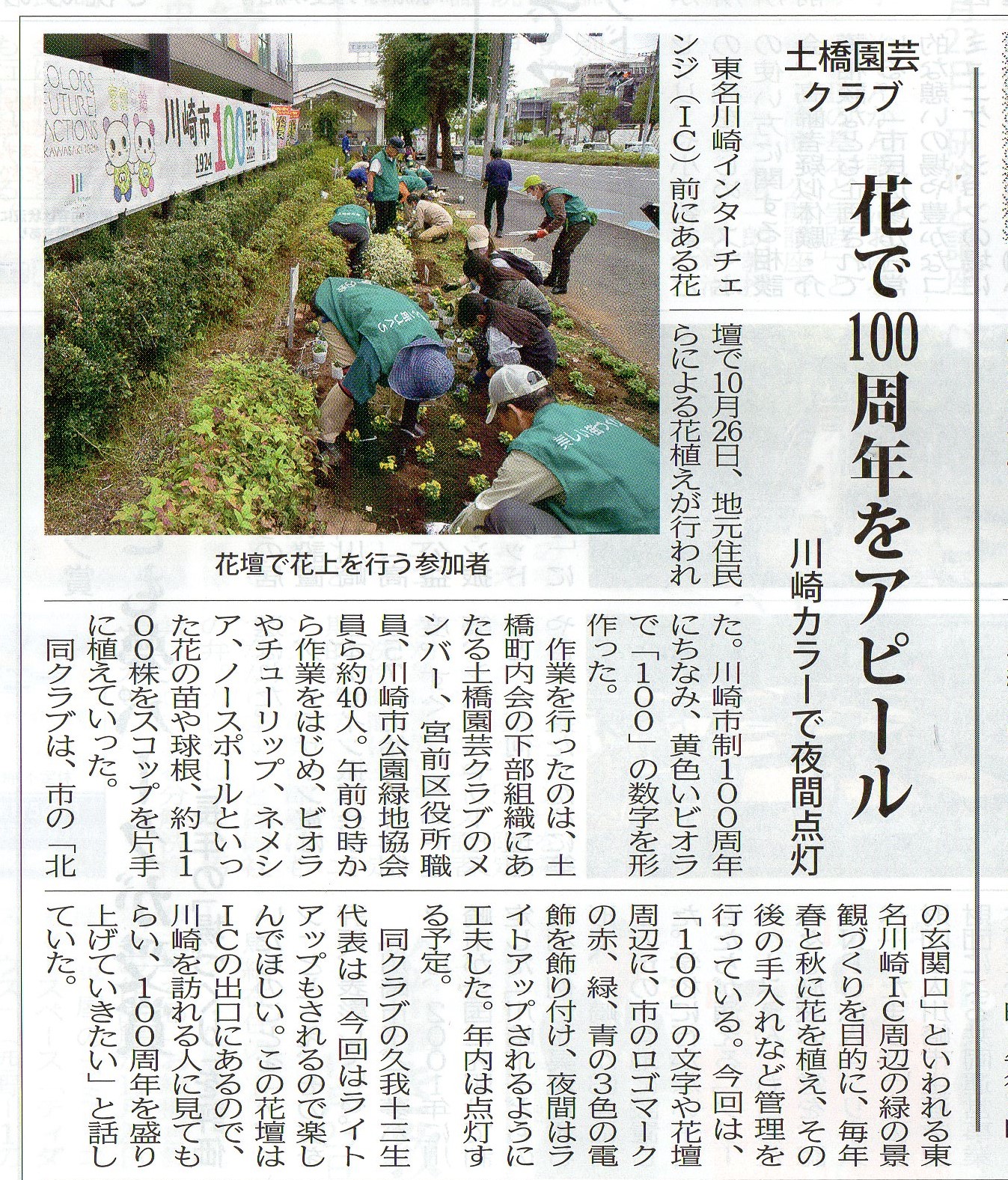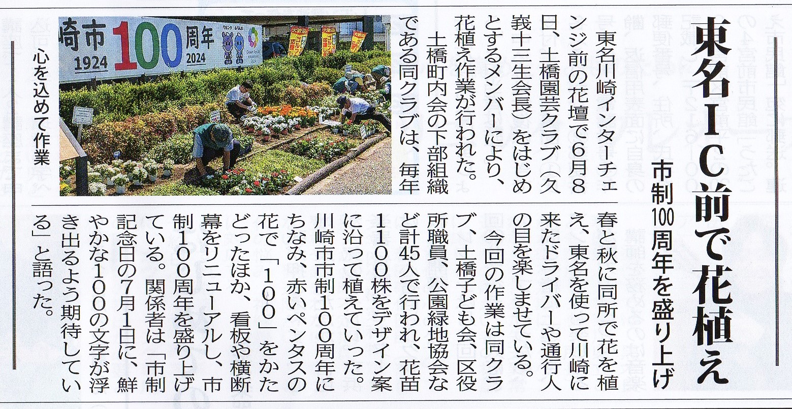 折から本年は川崎市の創立100周年の記念の年、東名川崎インターチェンジ前花壇には100周年を祝う横断幕が取り付けられ、花壇には赤いペンタスの花で100文字を描きました!