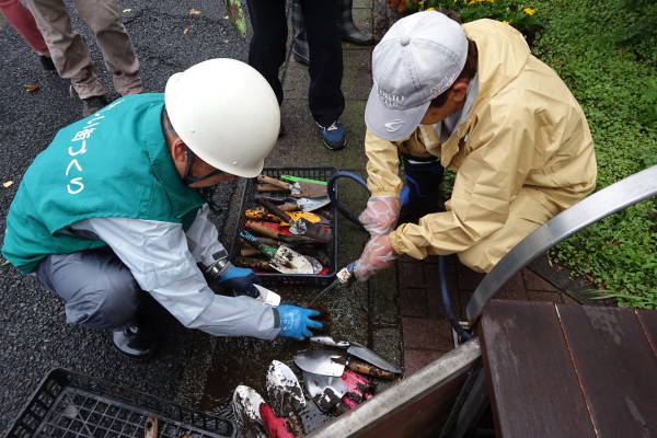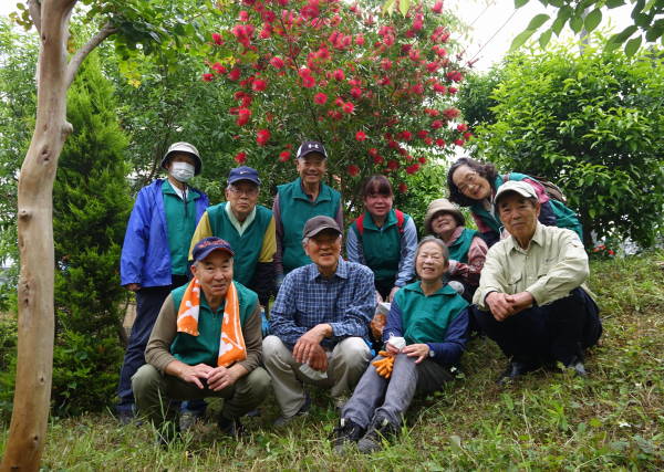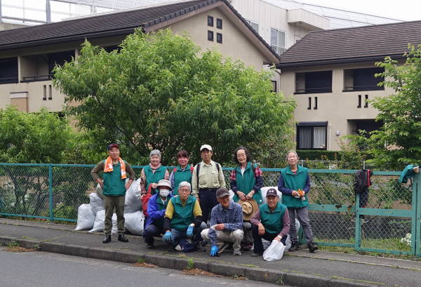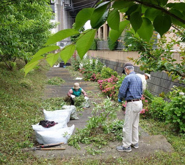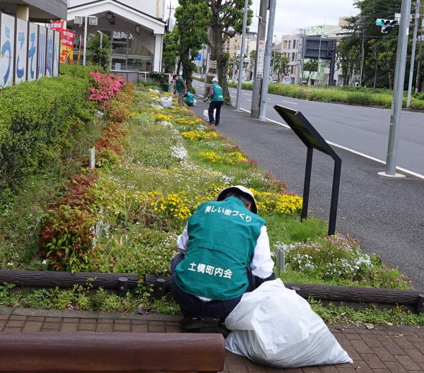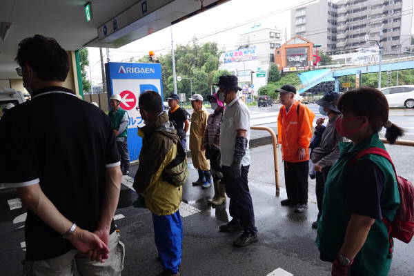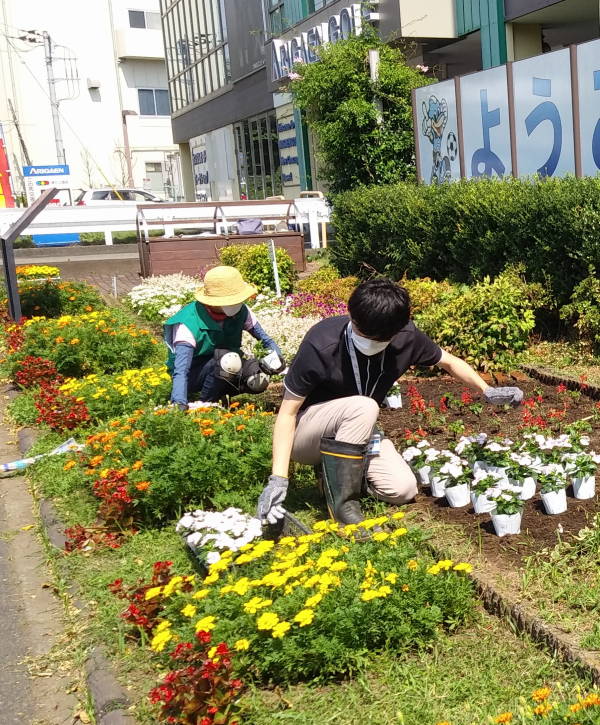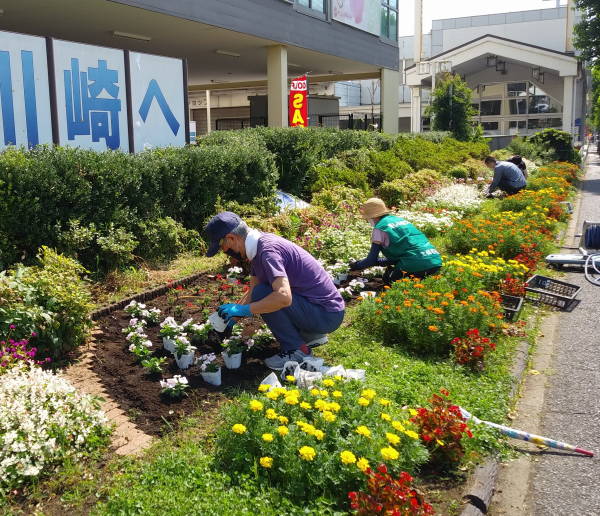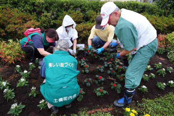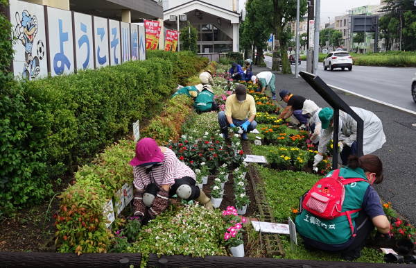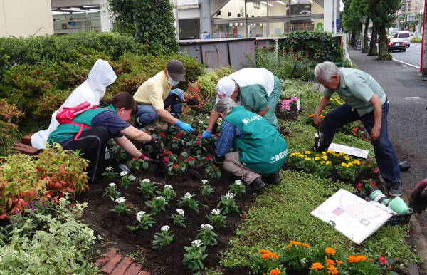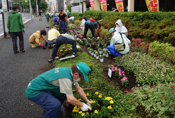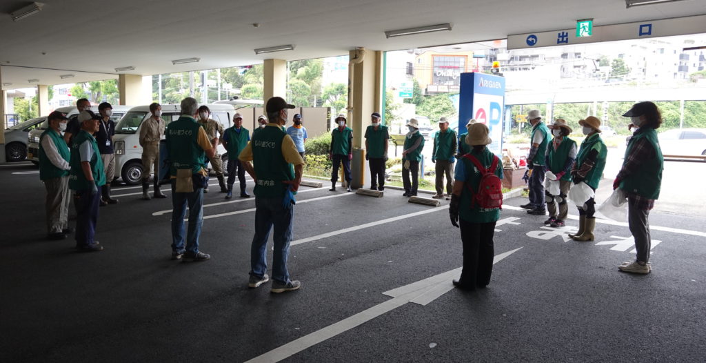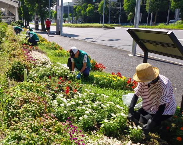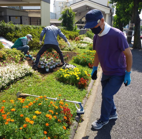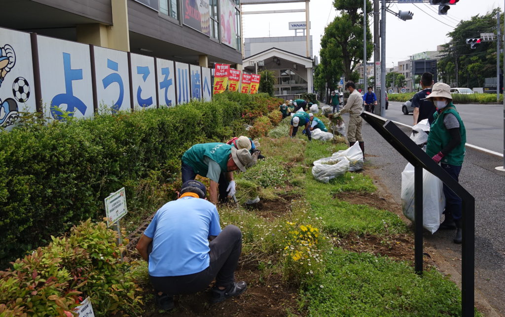 薄曇りながら湿度が高く蒸し暑さの中、夏花壇へ向けて東名インター前花壇の花床つくりを行いました。宮前区役所地域振興課及び(公財)公園緑地協会のご支援もいただき、総勢28名で2時間の作業でした。