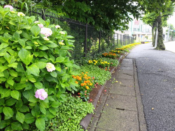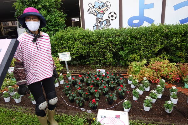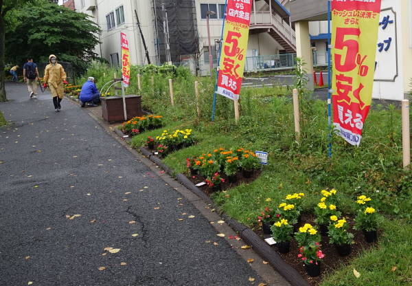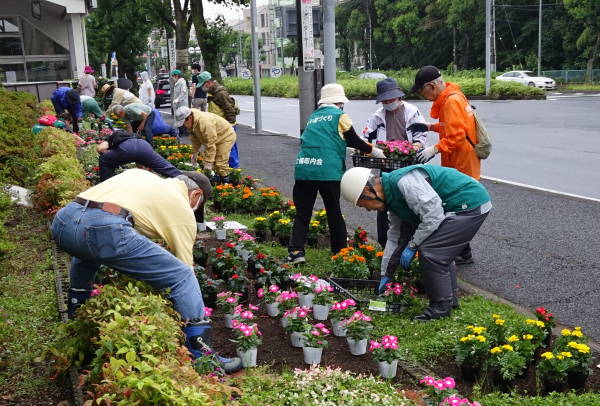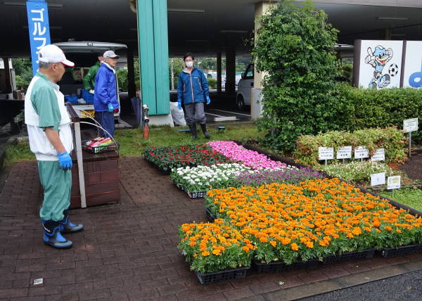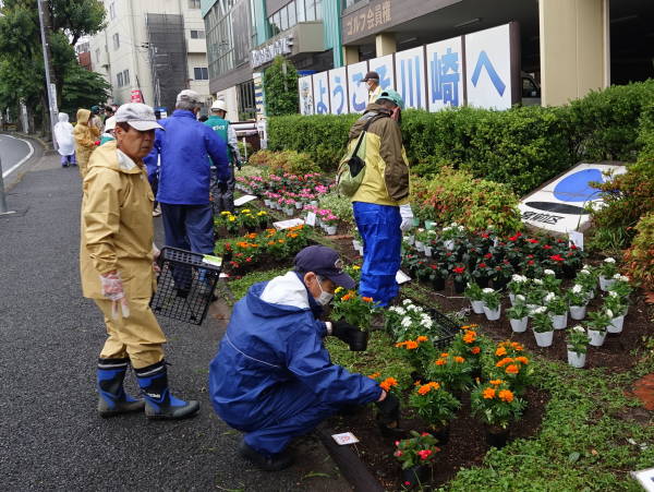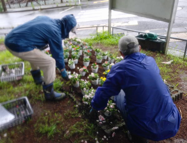 雨が降りしきる中、コロナ騒ぎのため例年より一か月遅れていた花苗が届き、東名花壇を除く、その他3か所の花壇への花植えがようやく終わりました。