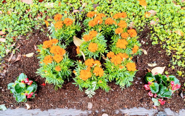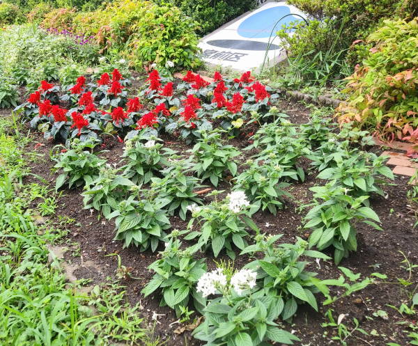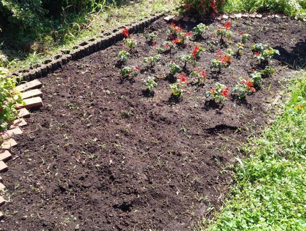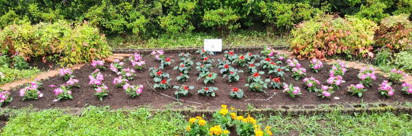 6月13日の夏花壇の花植の翌日、二日続きの雨に900株の花たちは元気に定着しています。