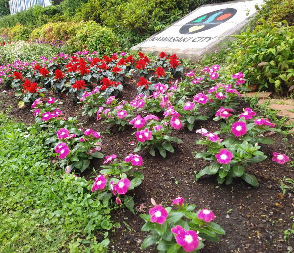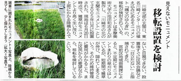 タウンニュース紙の宮前区版に6月13日に実施した東名川崎インター前の花植の模様が記事になりました。今日(6月26日付け)の記事には、東名川崎インター料金所と、東名花壇が面する市道尻手黒川線に挟まれた三角地に設置された「縄文のゆらぎ」のモニュメントが記事になりました。モニュメントの説明文は東名インター前花壇のボードに記述されています。