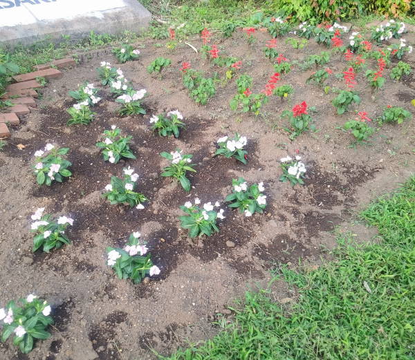 気温36度とも報道された猛暑の8月7日、先月まで降り続いた長雨のため完全に腐って消滅した東名インター前花壇の日日草ほかの補植を行いました。