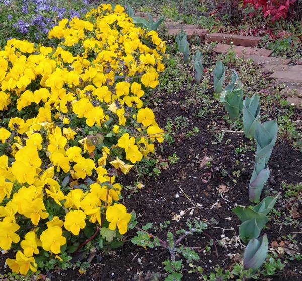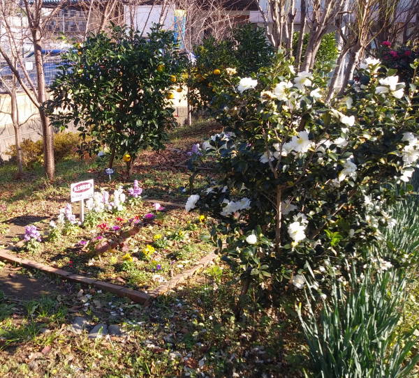 雪国にも全く雪が降らないという異常な気象が続いていますが、土橋園芸クラブが管理する花壇は、気候の暖かさと適宜な雨に恵まれ、順調に春に向けて成長を続けています。