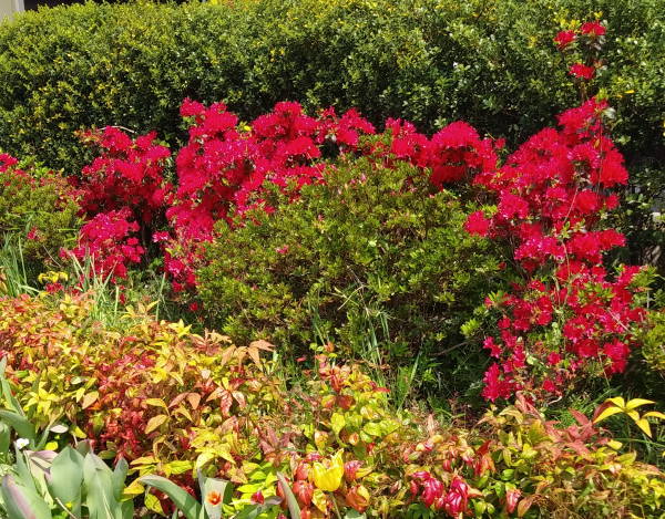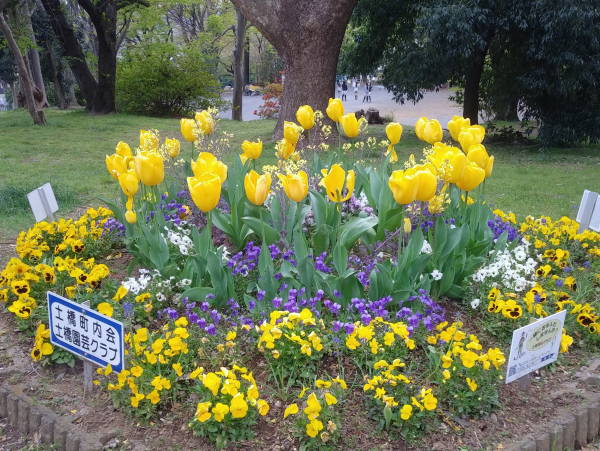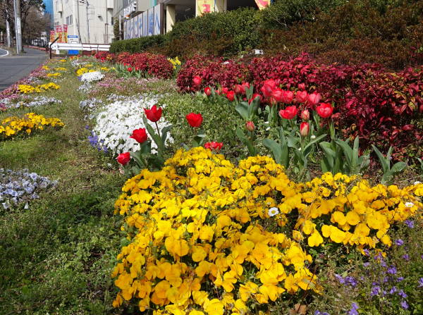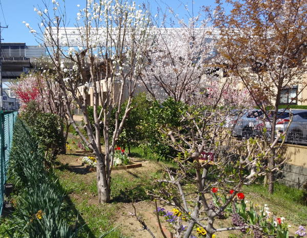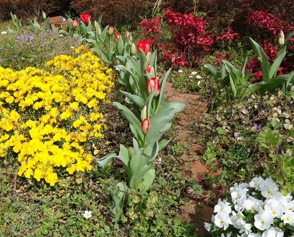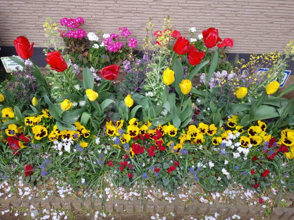 開花宣言の早かった今年の桜も、その後の冷たい北風にやや足踏み、こんな中ポカポカ陽気になった今日の花壇はまさに春爛漫の花盛りです!
