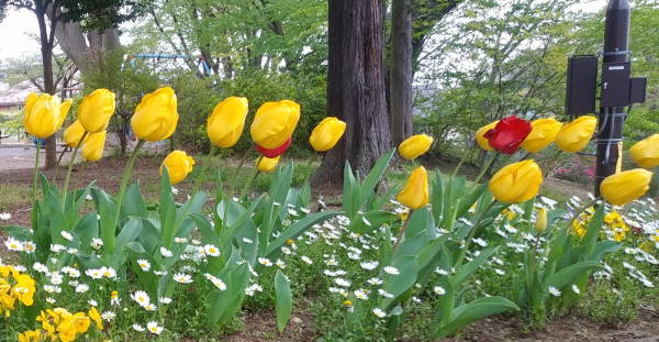 とどまるところを知らない新型コロナウイルス禍、花壇のチューリップの様に赤信号から、黄信号に代わってほしいものです!