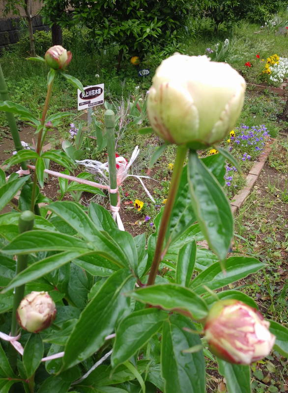 コロナ騒動で寂しい連休中日、矢上川花木園でシャクヤクが花を開きました!東名花壇には真っ赤なキリシマツツジが満開です。