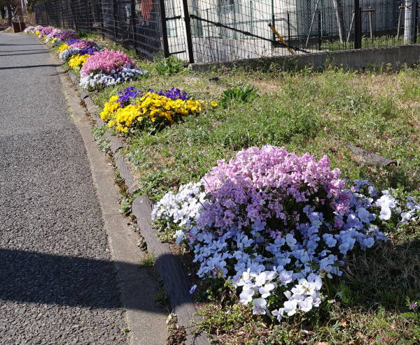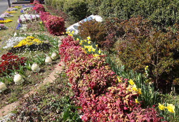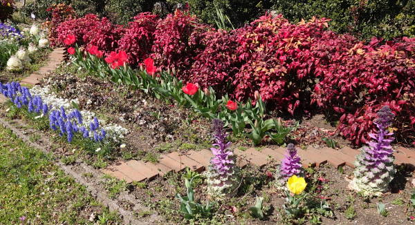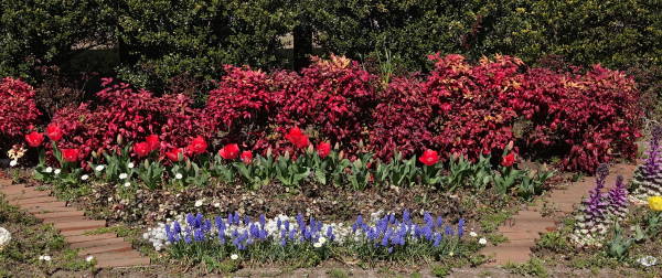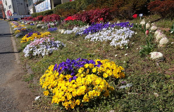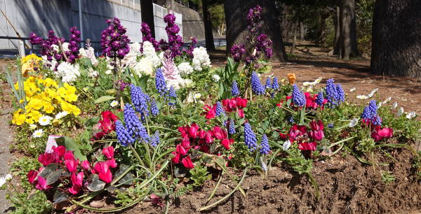 東京に桜の開花宣言が出た春分の日(3月21日)の昼下がり、東名インター前花壇、矢上川花木園、土橋7丁目公園の花壇の様子を見に行きました。ムスカリはまさに満開、赤いチューリップは一方では散り際、一方で未だ蕾もあり、他の色は蕾状態です。矢上川では花桃が咲き始めました。(老)