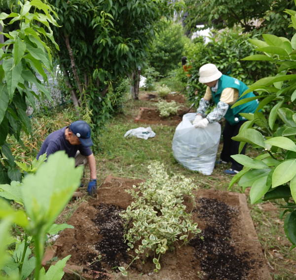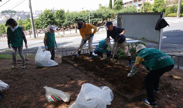 土橋園芸クラブ及び土橋矢上クラブが管轄する東名インター前花壇以外の花壇(その他花壇)の花床つくりを行いました。前夜の雨も上がり、やや曇りがちの絶好の作業日和でした!