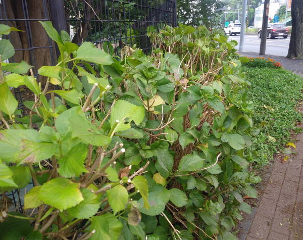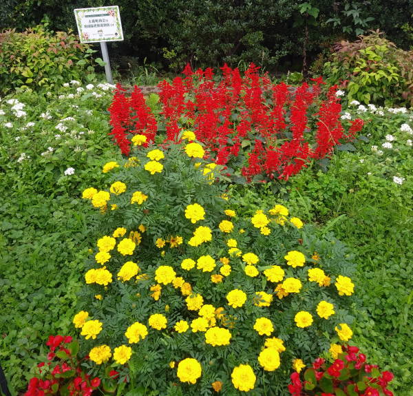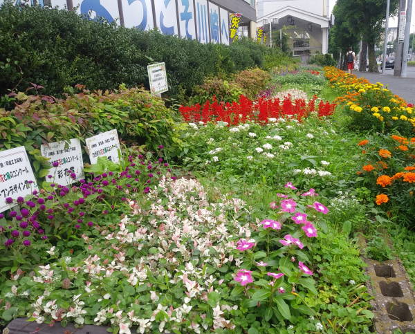 今年の花壇は長梅雨がかえって好影響を与えたのか、美しい花壇が現れています。枯れ花となってしまったアジサイの花殻も剪定してすっきりと、花壇裏側の水路敷きも雑草がきれいに刈り込まれ、花壇を盛り立てています。