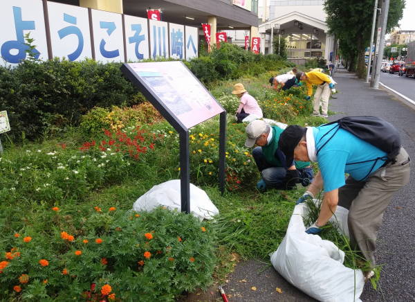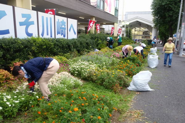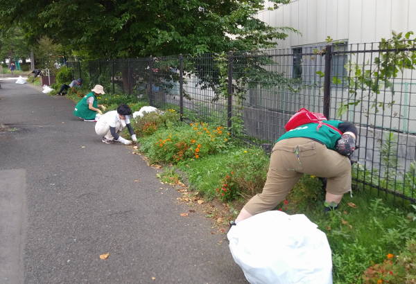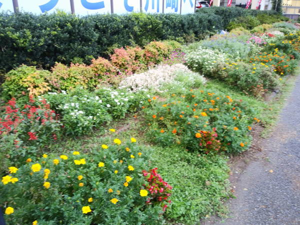 9月に入ったというのに、まるで真夏のような天候、東名花壇の草取りを企画したところ、何と35℃近い気温に、しかし開始時間の午後4時には雲がかかりやや涼しい風が吹くものの湿度は高く、皆汗だくで草取りに励みました。このところの適度な雨で雑草の繁茂は激しく、75Lのごみ袋20個もの量になりました。