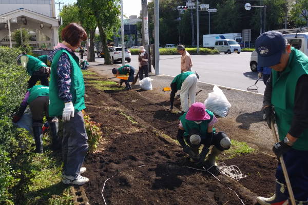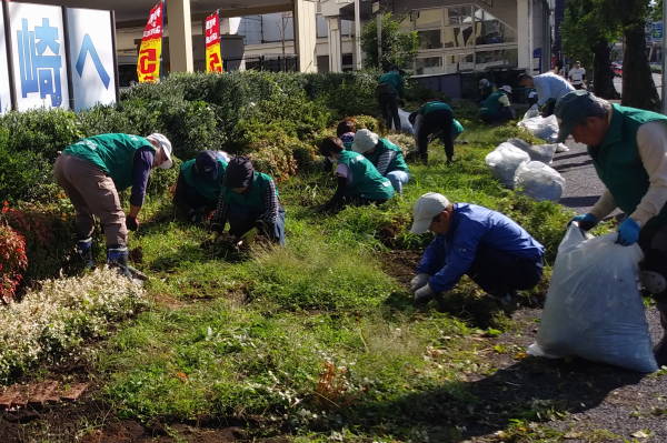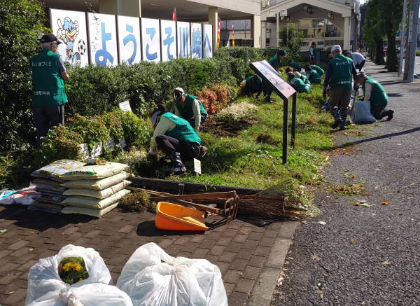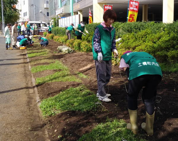 台風21号が前日にもたらした激しい雨の影響もほとんど感じることなく快晴の空の下、会員28名、区役所地域振興課から2名、公園緑地協会から3名と多数の参加者で、盛りを過ぎたとはいえ未だ十分に美しい花をつける花たちを惜しみながら抜き去り、根の張った雑草を掘り起こし、肥料をすき込み、来週の花植のデザインの線引きなどの作業を、皆慣れた手順でやり終えました。
