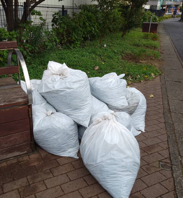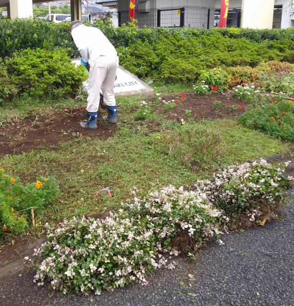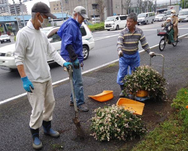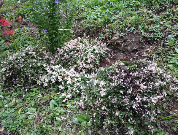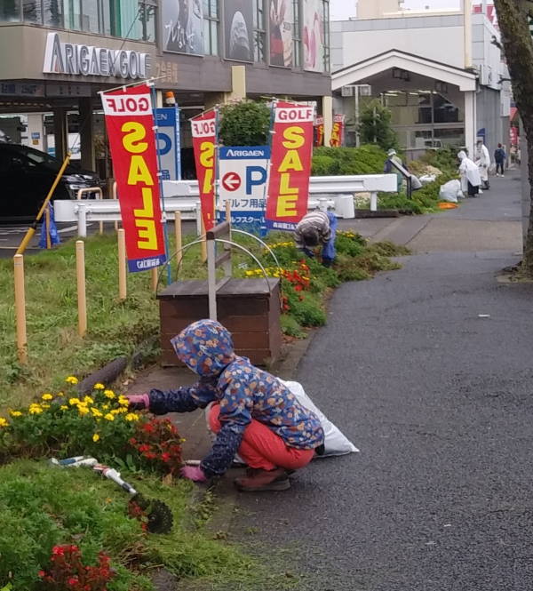 小雨模様の中で草取り 先月末に予定した東名インター前花壇の草取り、台風の接近などで流れ、事前に予定した今日10月1日も朝から小雨模様、雨の先行きを見通して決行のメールを出したところ、10名もの参加者が、70L袋12個もの雑草を抜き取りました。 雨合羽を着て! 今年12月に東名インター前の島にある「縄文のゆらぎ」というモニュメントが花壇中央に移設されることになり、この事前測量作業に備えて、該当部分にバッティングする宿根草のオタフクナンテンと初雪カズラを一時的に矢上川花木園に移植することとして、その移植工事も合わせて行いました。(写真は掘り上げた初雪カズラ) 手押し車で矢上川花木園へ 矢上川花木園へ仮移植された初雪カズラ 折から矢上川花木園は彼岸花が満開 今日の成果! ツイート